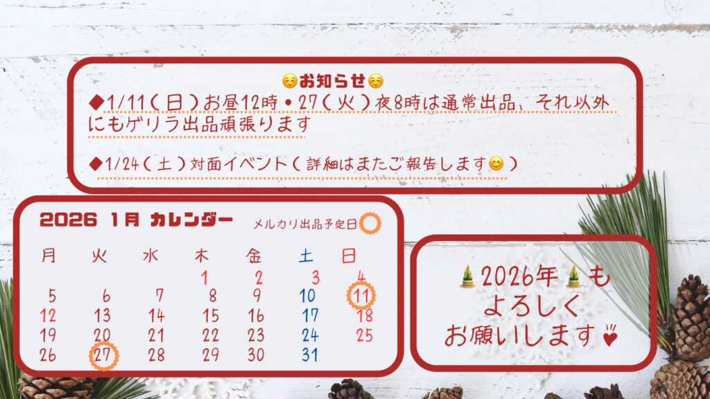 旧年中は、作品を見ていただいたり、お迎えいただいたりと、大変お世話になりました🙇♀️もっともっと楽しんでもらえるように、今年も頑張ります💪✨ 1月11日(日)昼12時にメルカリ出品予定なのは‥ 年末年始にひたすらチクチ […]