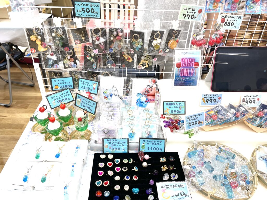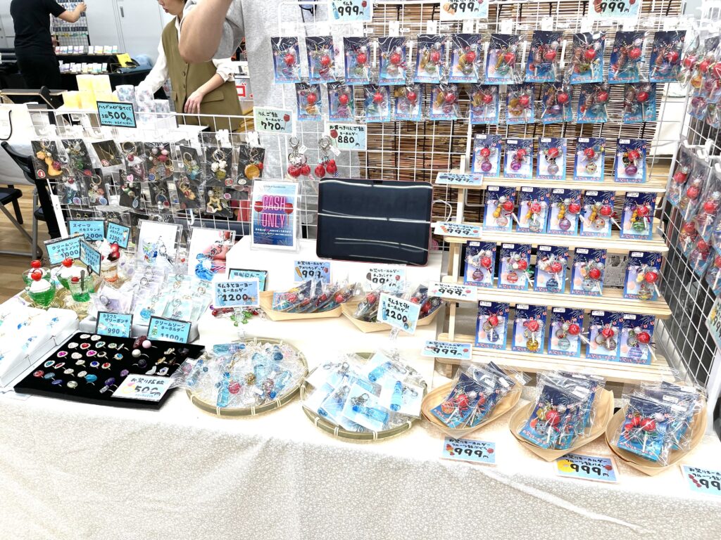 メインはお祭りキーホルダーで、クリームソーダやラムネのキーホルダー、また対面イベント限定の「お祭りくじ引き」や「おもちゃ風ゆびわ」も並べました。初めての対面イベントだったので、至らぬ部分も多かったのですが、なんとかやり切りました💦