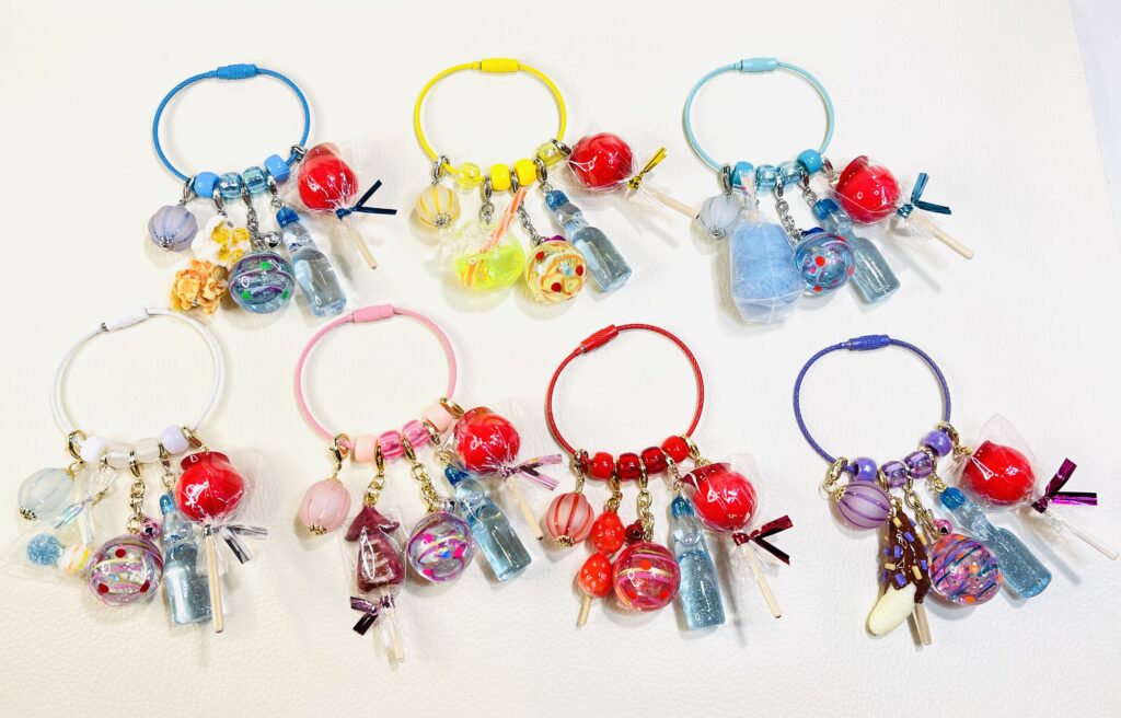 1ポップコーン🍿、2金魚鉢ジュース、3わたがし、4どんぐり飴、5イカ焼き🦑、6🍓いちご飴、7チョコバナナ