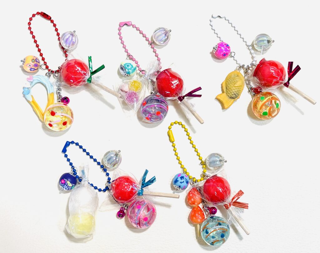 定番のお祭りキーホルダーはおひとつ1100円。8チュロス、9どんぐり飴、10たい焼き、11わたがし、12フルーツ飴いちご🍓。