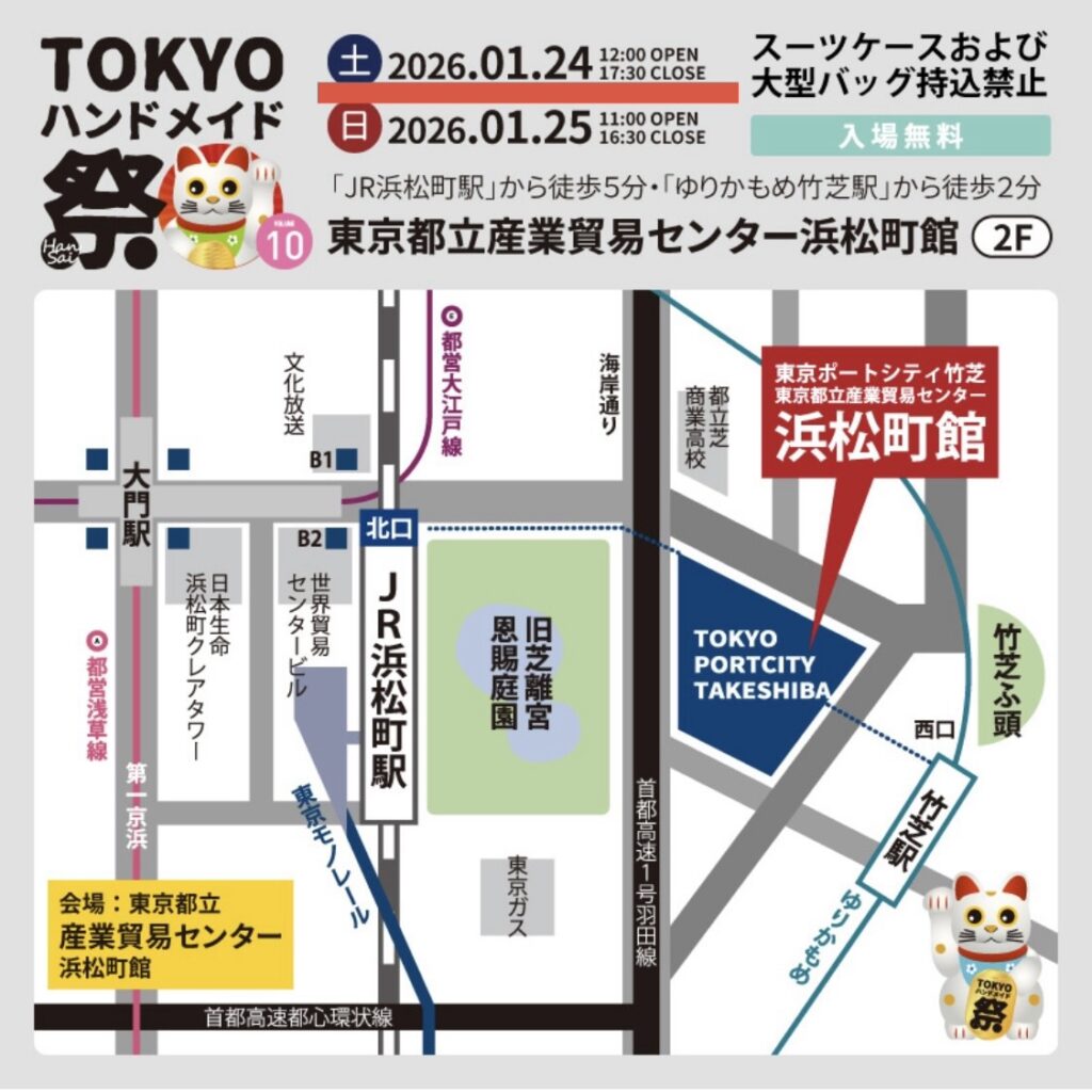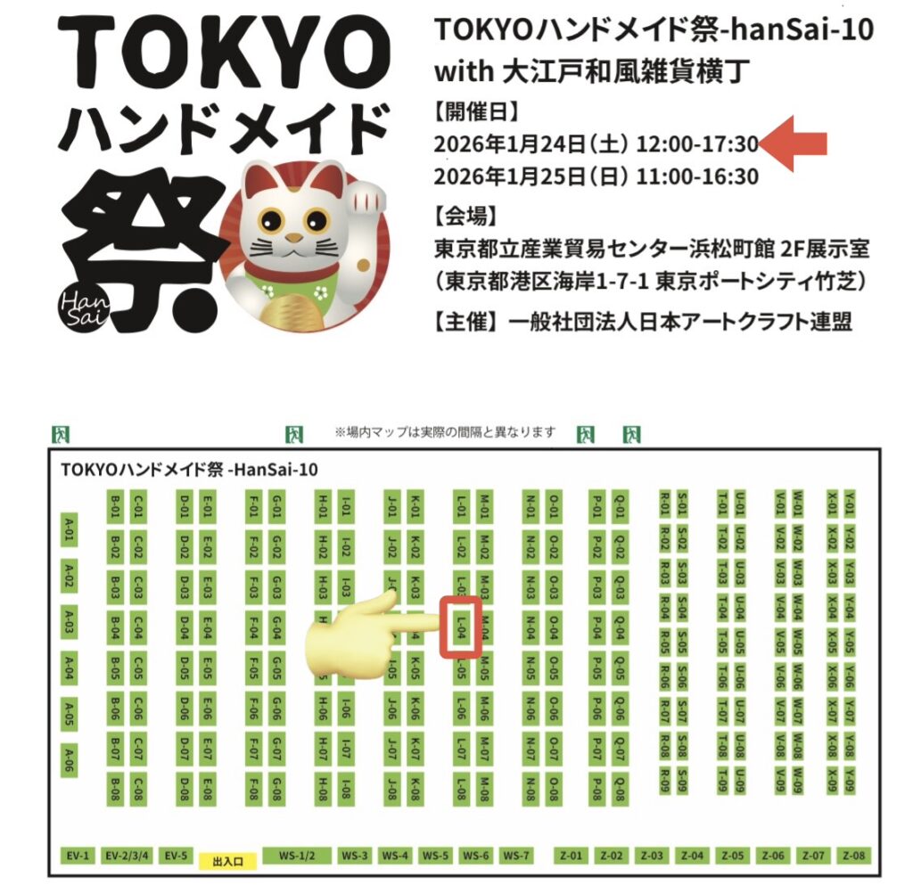 1/24(土)対面イベント出店のお知らせ📢 2026年1月22日 最終更新日時 : 2026年1月22日 いっちゃん 土曜日のみの出店デス😊ブース番号はL-04、ちょうど会場の真ん中あたり。 いろんなハンドメイド作家さん、作品が見れますヨ☆ 入場無料‼️ぜひご来店ください🙏