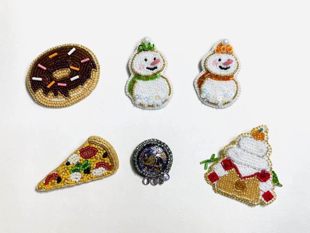 12月14日(日)お昼12時🕛メルカリ出品はこちら😃👇 2025年12月14日 最終更新日時 : 2026年1月4日 いっちゃん ビーズ刺繍ブローチいろいろ 🍩ドーナツ、雪だるまさん(グリーン・オレンジ)、ピザ🍕、アンテークガラスボタン、鏡餅 の6点 ビーズ刺繍リング 2種類お作りできました💍✨フリーサイズです ミニチュアコーヒーチャーム こちらは追加で3点、完成しました☕️ ビーズ刺繍は、まだまだ失敗も多くて「自分用」も増えてますがwなんとか見ていただけるものをご用意しました😊1個作るのに時間はかかりますが、とっても楽しくチクチク🪡できています。 お昼12時になりましたら順番通り出品します📢よろしくお願いしまーす✨