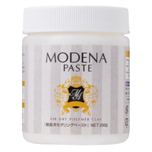 ドロリとした粘土。普通の粘土を水で溶いてボンドを混ぜてもそれっぽいペーストになりますが、このモデナペーストを使ってしまうと戻れません。とろ~りクリームに向いてます。混ぜた絵の具の発色もバッチリで、お祭りキーホルダーのチョコバナナ🍌にチョコとしてかけたり、フランクフルトのケチャップとしても使っています。