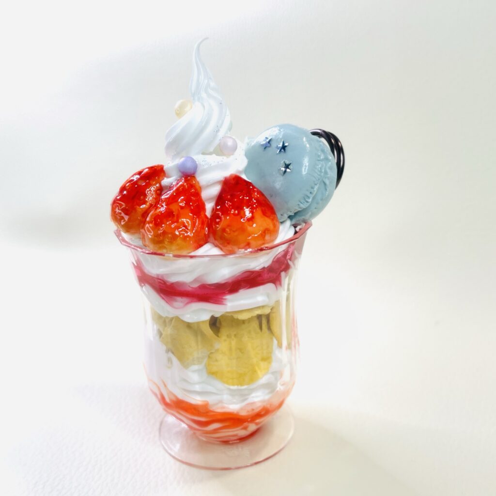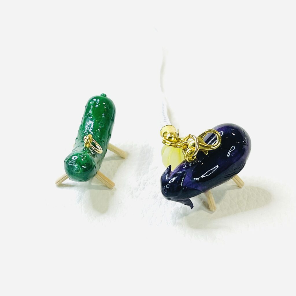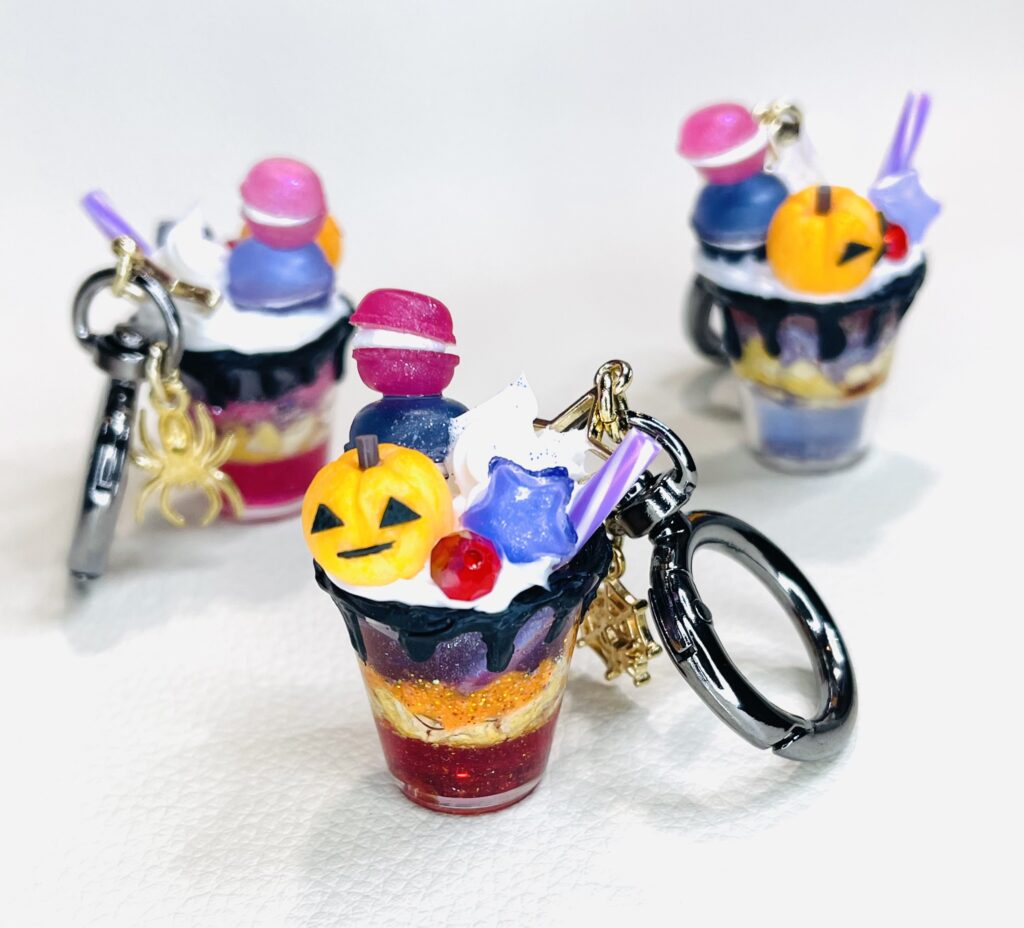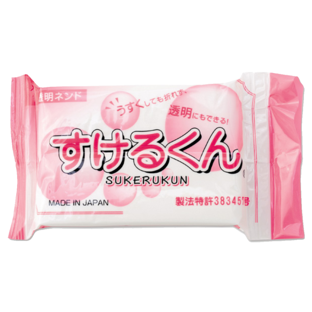 普通の粘土じゃ表現が難しい「透け感」をだせる粘土。透明というより「透けてるねぇ」程度。お寿司のネタ部分や、お祭りキーホルダーのパイン飴・どんぐり飴の部分で使っています。かなりオイリー(?)で乾くのに時間がかかるし、成型しても伸縮率がすごい、慣れるまで向き合わないとならないのはいつものこと。敬意をこめてすける”さん”と呼ばせてもらっています。