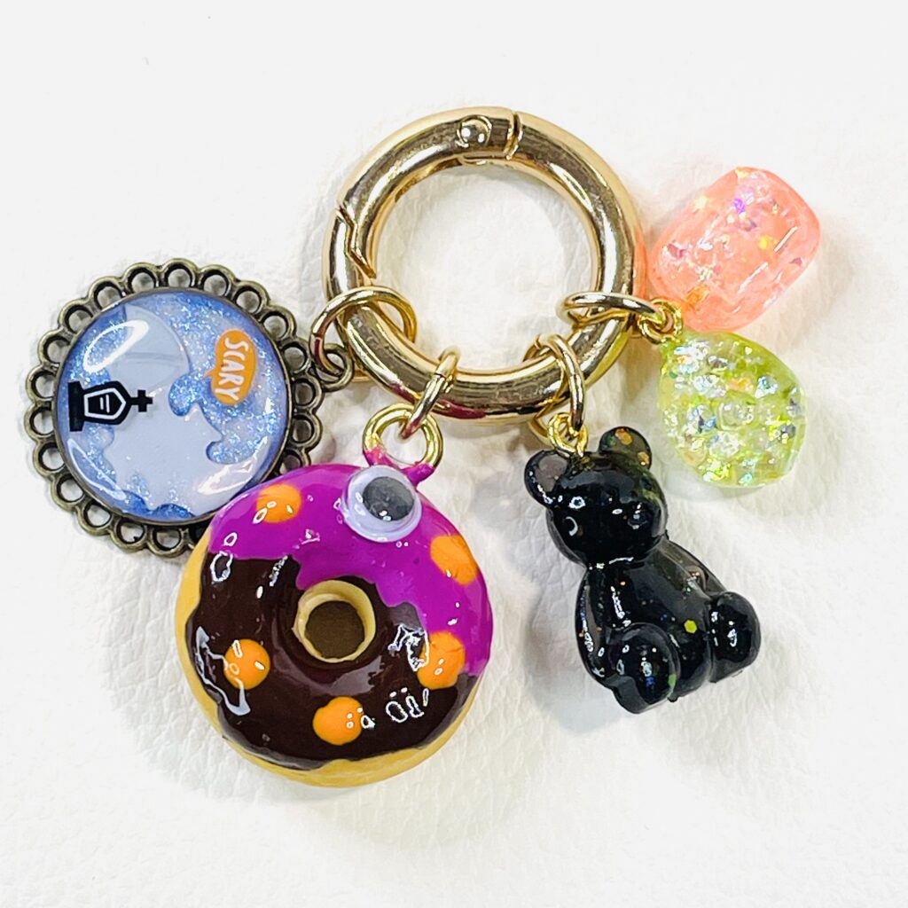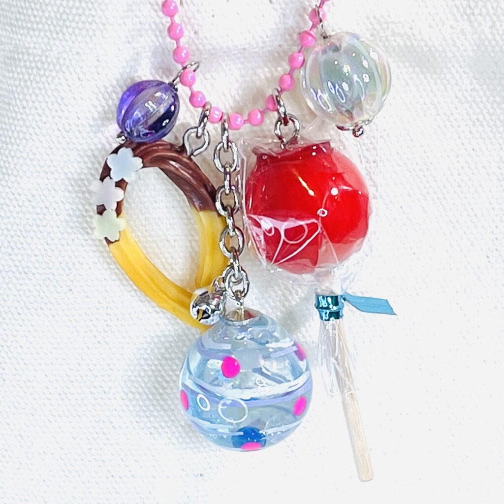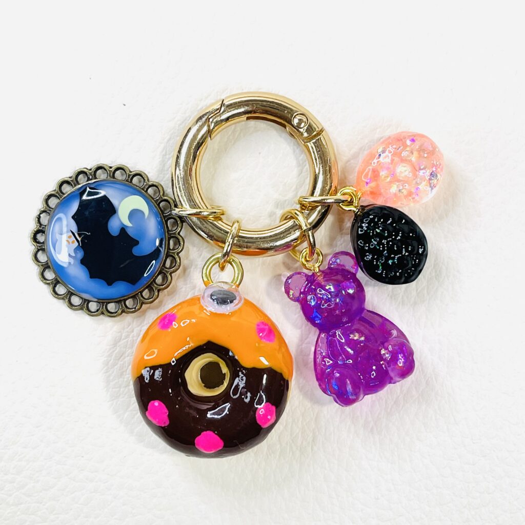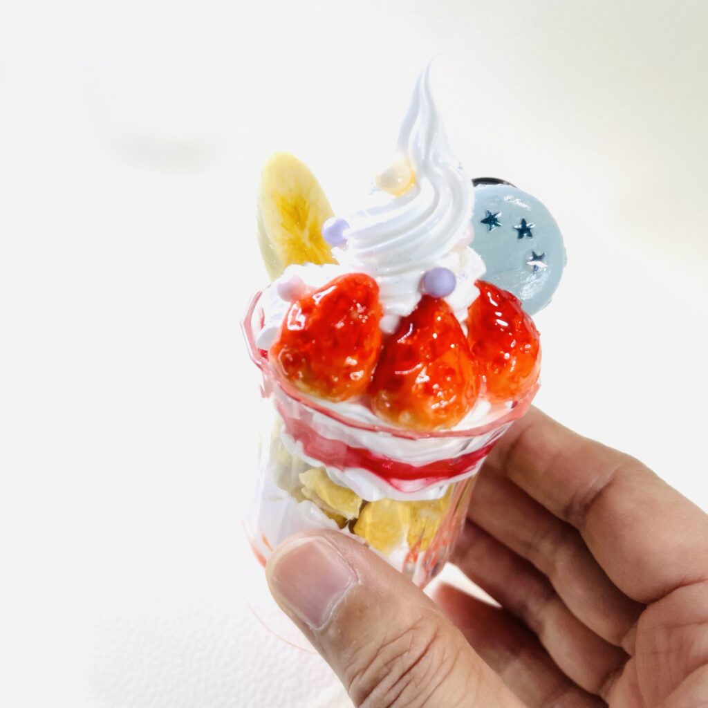 普通の粘土じゃ表現が難しい「透け感」をだせる粘土。透明というより「透けてるねぇ」程度。お寿司のネタ部分や、お祭りキーホルダーのパイン飴・どんぐり飴の部分で使っています。かなりオイリー(?)で乾くのに時間がかかるし、成型しても伸縮率がすごい、慣れるまで向き合わないとならないのはいつものこと。敬意をこめてすける”さん”と呼ばせてもらっています。