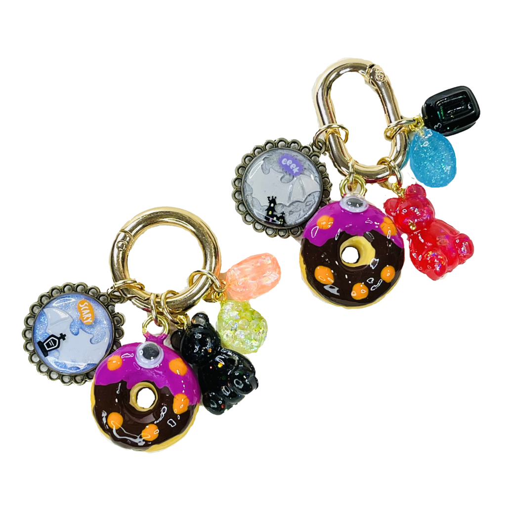 まだ9月半ばですが、ハロウィンアイテムをリリースしました😃キョロ目のドーナツに、キャンディベアやハロウィンモチーフをつけたジャラジャラキーホルダー⭐️